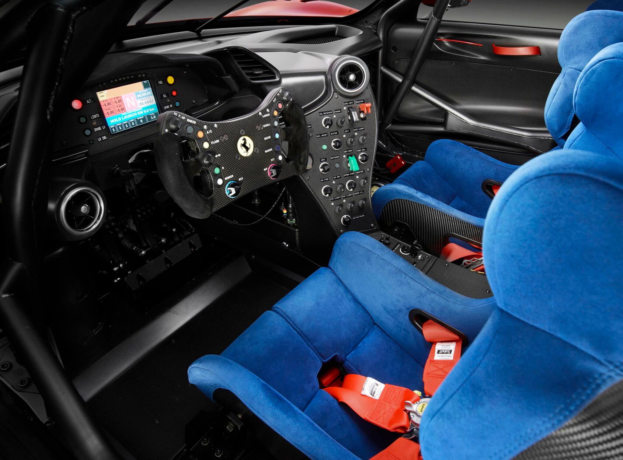 Outside of a handful of parts, the whole package is coated in a client-selected hue called Rosso Vero. The interior is mostly untouched from the donor 488 GT3, other than a re-trim of the seats in a bright blue and new carbon fiber door cards.