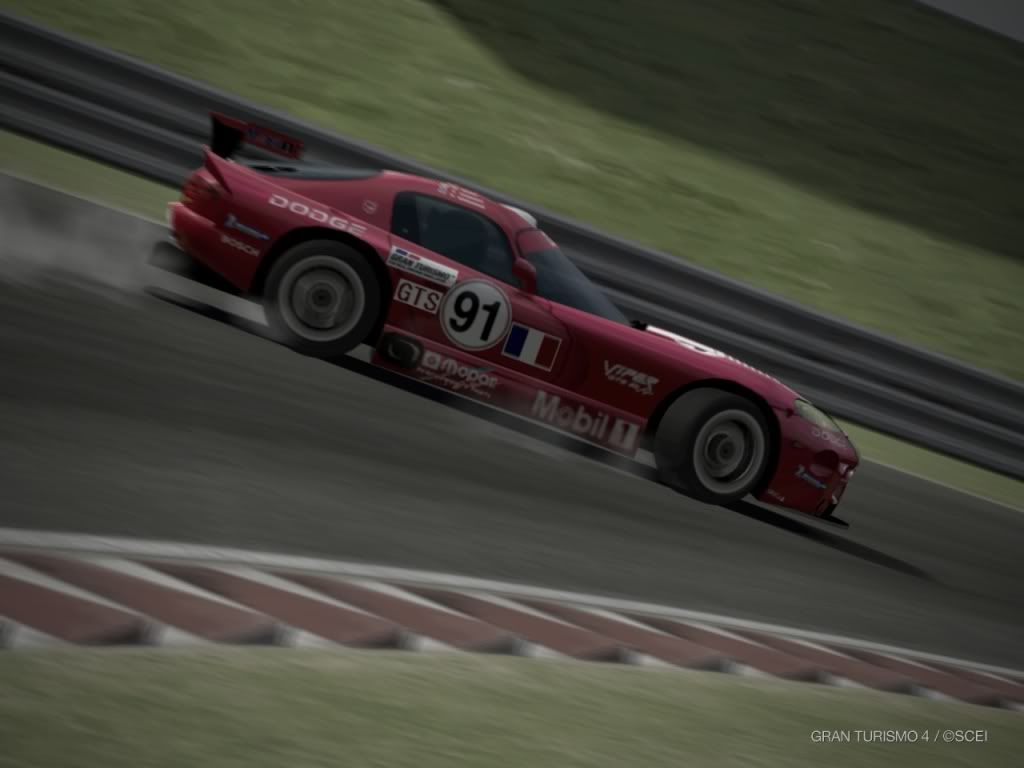 BTW: that viper looks badass in red, hehe. ALOT better than the girly purple i had for a while. But a no no on the rims for me. they came out blue. Also next time, you might try saturating just the reds in the picture, instead of the whole colour range in the picture, since now the grass looks a tad too bright (I'm assuming you ran it through a Photo editor of some sort, since that doesn't look like a natural GT4 results)