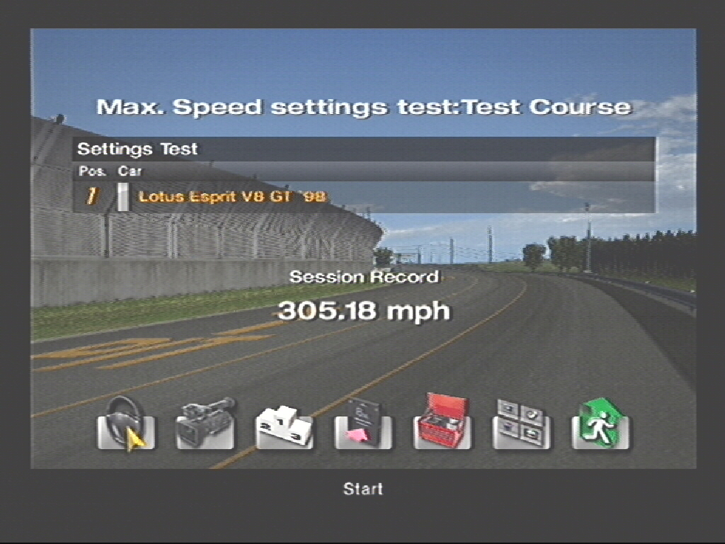 Ive reached 470 km/h (hence the username) in the Cadillac CIEN. Put NA stage on it and put the gear ratio to 25, and added Nitrous, all the way to the power end setting. At about 380 km/h on the Test Course I let the NOS jet my car to 470 km/h (300 mph=480 km/h). I needed the other cars ahead of me so I slowed right down and caught them up at over 350. I jammed R1 at 380 and reached 470. It only lasted a few seconds as the trumendous air resistance and the short but powerful supply of NOS only threatened to hurl me into the air. 465, 450, I slowed down to about 390 but the other cars did not overtake me... :dopey: Sadly I cannot show you any proof as we don't have a video camera or anything. :(