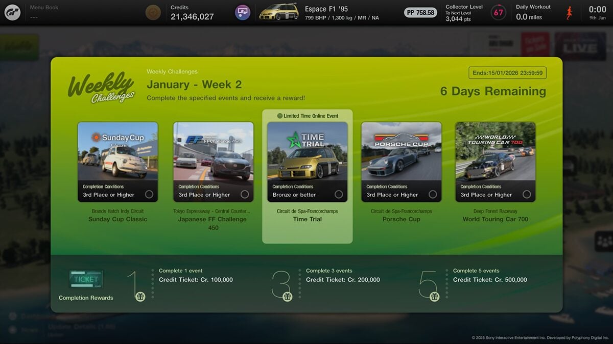 In order to have access to the Weekly Challenges you’ll need to have completed GT Cafe Menu Book 39 and watched the ending movie. The events update at midnight local time on Friday mornings, so we’d expect the next set of the new-look events on the morning of Friday January 16.