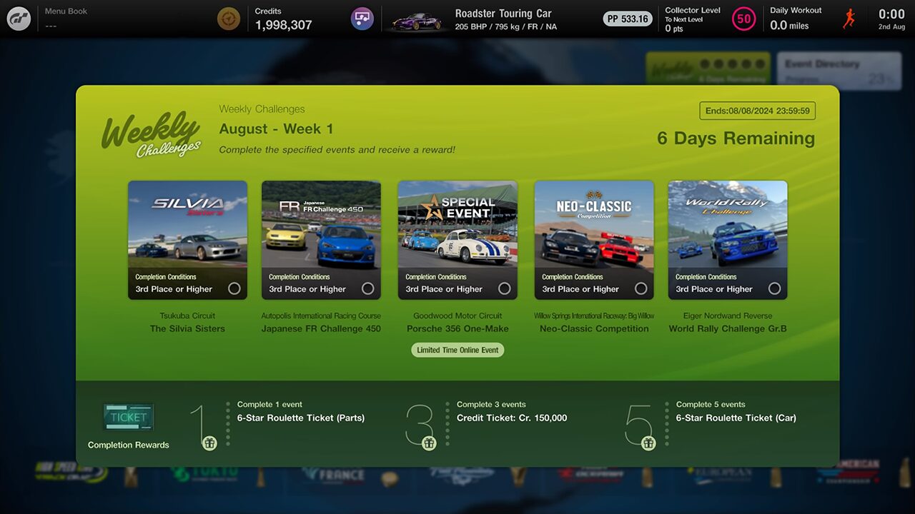 You can score a rare Six-Star (Car) Roulette ticket for completing all five events during the week’s availability, which awards a vehicle worth between 500,000cr and just over 3m and can include Invitation-only cars. There’s a Six-Star (Parts) ticket for finishing one event, and a 150,000cr ticket for clearing three — which you’ll need to redeem from your garage’s Gifts section to add the credits to your in-game bank account.