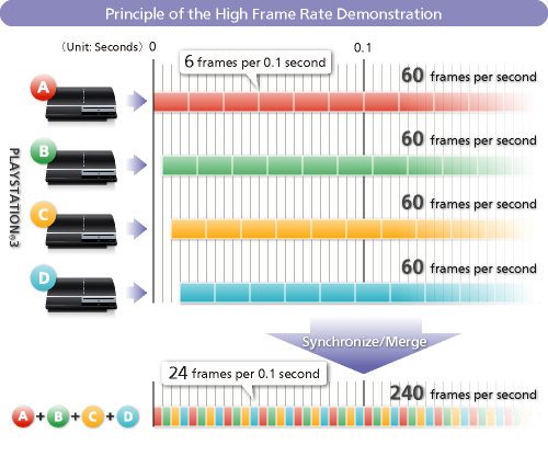 From the article: “The frame rate of a single PS3 is 60fps, or 1/60 of a second, but by having four PS3’s draw an image four times within this 1/60 of a second, a frame rate of 1/240 of a second is made possible.”