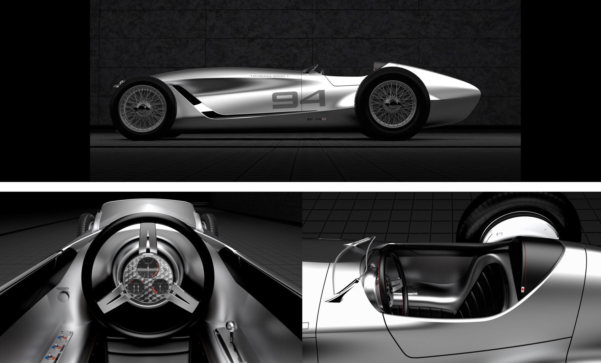 Inspired by the Grand Prix cars of the 1940s, the Prototype 9 gives a modern interpretation to a legendary formula. Finished in bare metal with classic center locking wire wheels, the car has all the right styling cues. You can almost imagine it sitting next to Juan Manuel Fangio and his Maserati 250F.