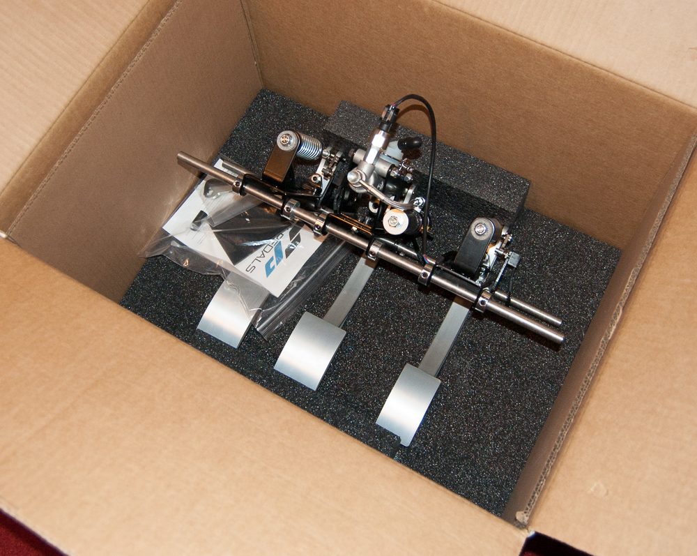 There’s no plastic here – the pedals are constructed from CNC-machined aluminum, laser-cut high-grade steel, Delrin spacers and spring guides, and Vishay potentiometers. My pedals were also equipped with the “Hydraulic Brake Upgrade Kit”, which includes Wilwood master and slave brake cylinders and sway bar end-link bushings from Energy Suspension to replicate the mechanics of the brakes in a real car.