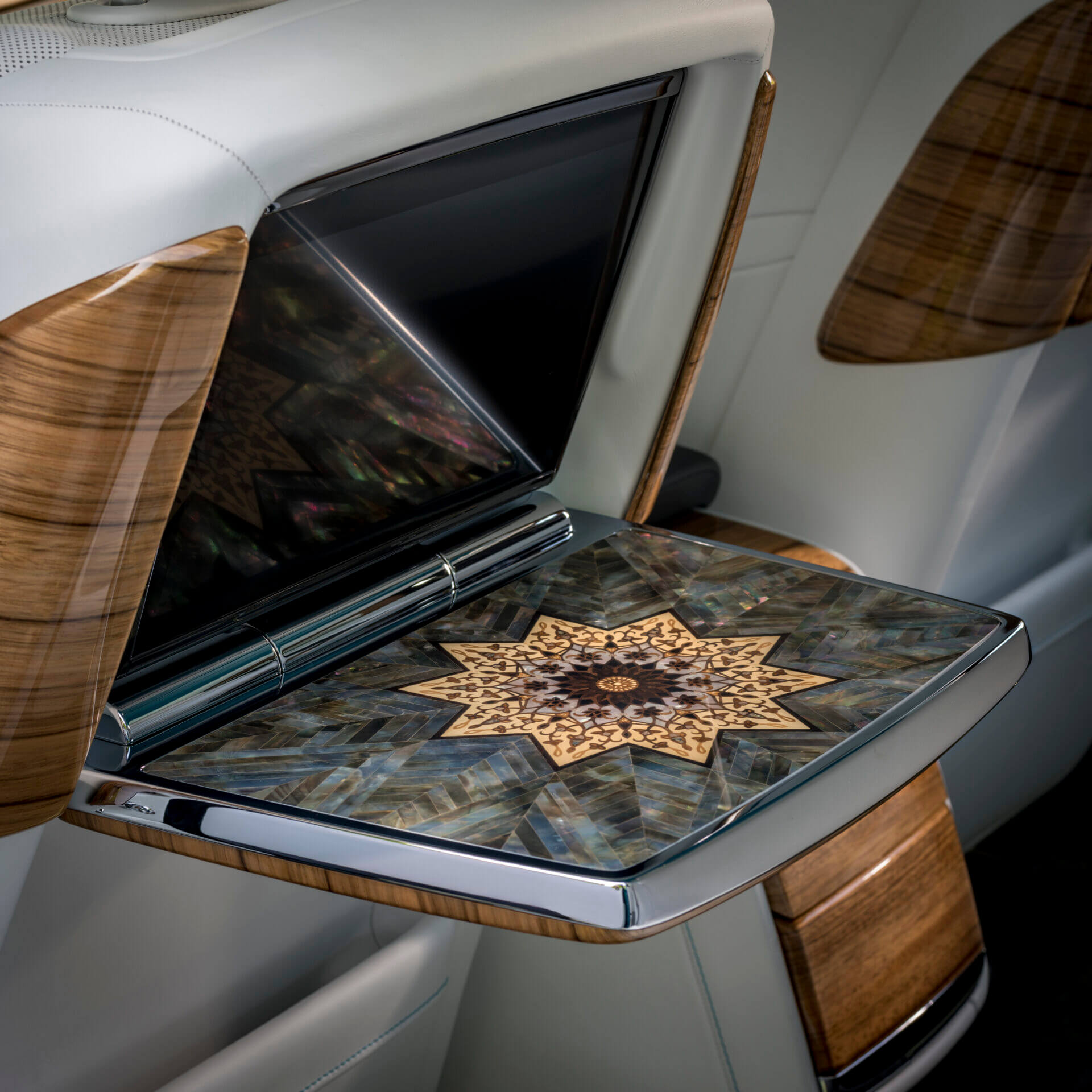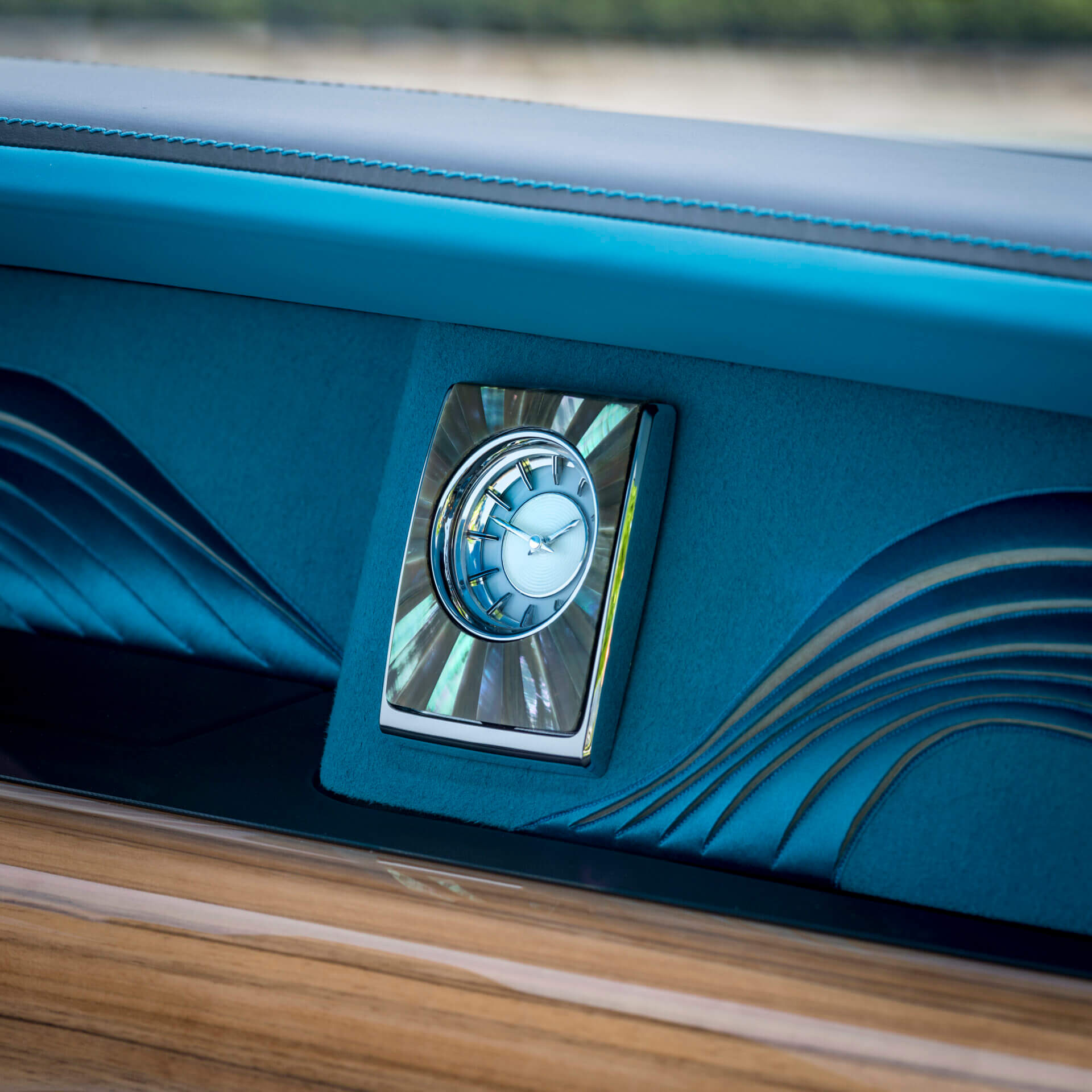 The Arabian Gulf Phantom meanwhile features silk and mother-of-pearl. With a turquoise (or rather Turchese, as Rolls-Royce terms it) exterior resembling the waters of the Gulf, the Phantom adds nacre marquetry and embroidered nautilus designs throughout. The gallery — that’s the bit of the dashboard in front of the passenger — features a sculpted silk applique by British artist Helen Amy Murray.