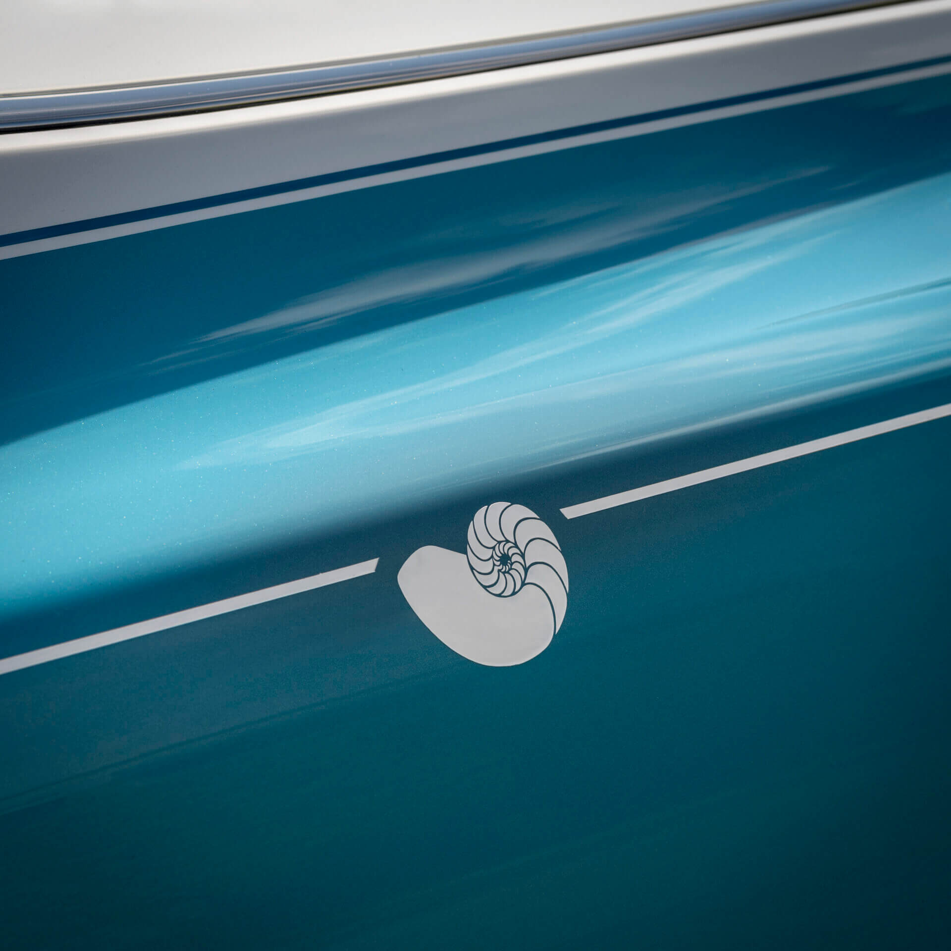 The Dawn Aero Cowling, commissioned by a customer in Japan, celebrates the city of Yokohama. You can clearly see the intent is a car that resembles a luxury yacht or powerboat, with open-pore teak panels on the rear deck. The blue and white paint and leather combinations reflect the sea in Yokohama Bay and the sails of the boats that navigate it.