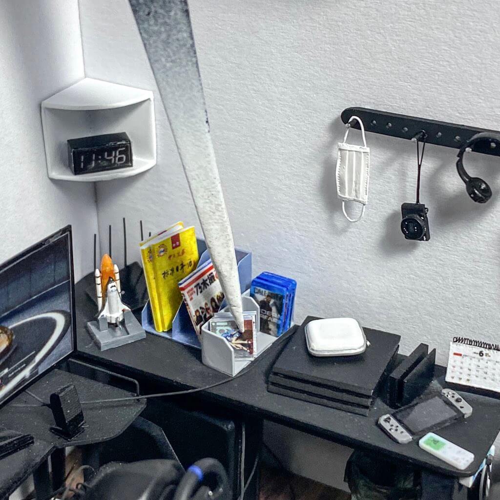 The room isn’t quite done there however. Along with all the necessary wiring — and we’d like to have a word with the occupant about cable management — there’s appropriate furniture, a clock, a kettle (for vital tea-making), and even an air conditioning unit. Recursively, there’s a model of a model in there too, with what looks like a 1:24 scale model of a 1:200 scale model of a Space Shuttle. You’ll also spot some J-Pop posters and a tissue box…