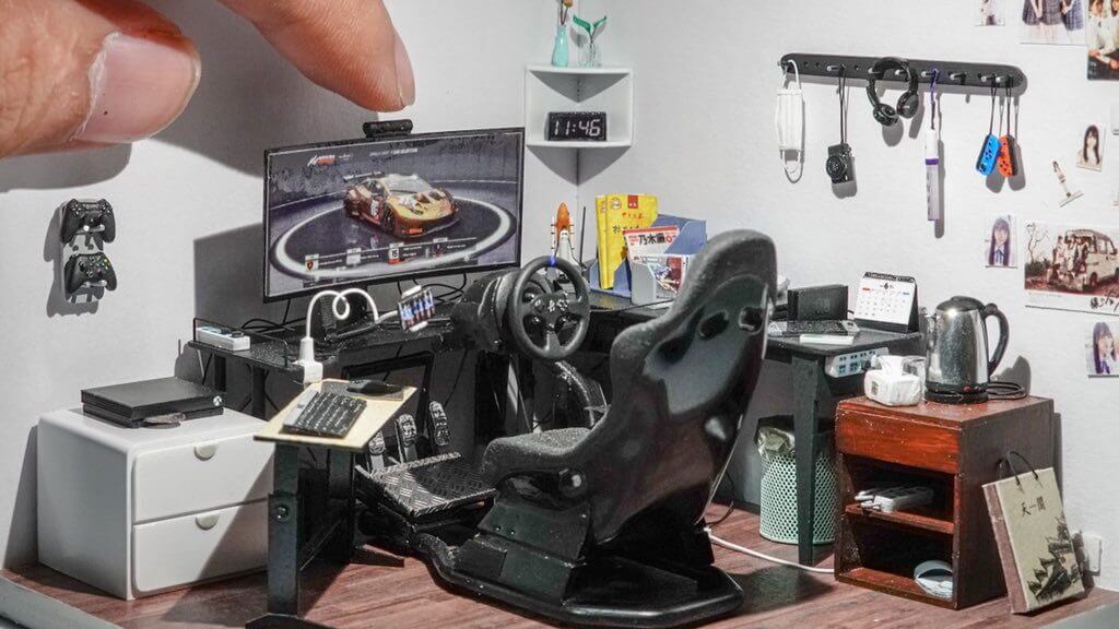 Like so many other keen sim racers, Twitter user XieLongLong spent over a month building their ideal rig, as part of a perfect space for gaming. Unlike everyone else however, this particular driving enthusiast made it in miniature – 1:24 scale, to be exact.