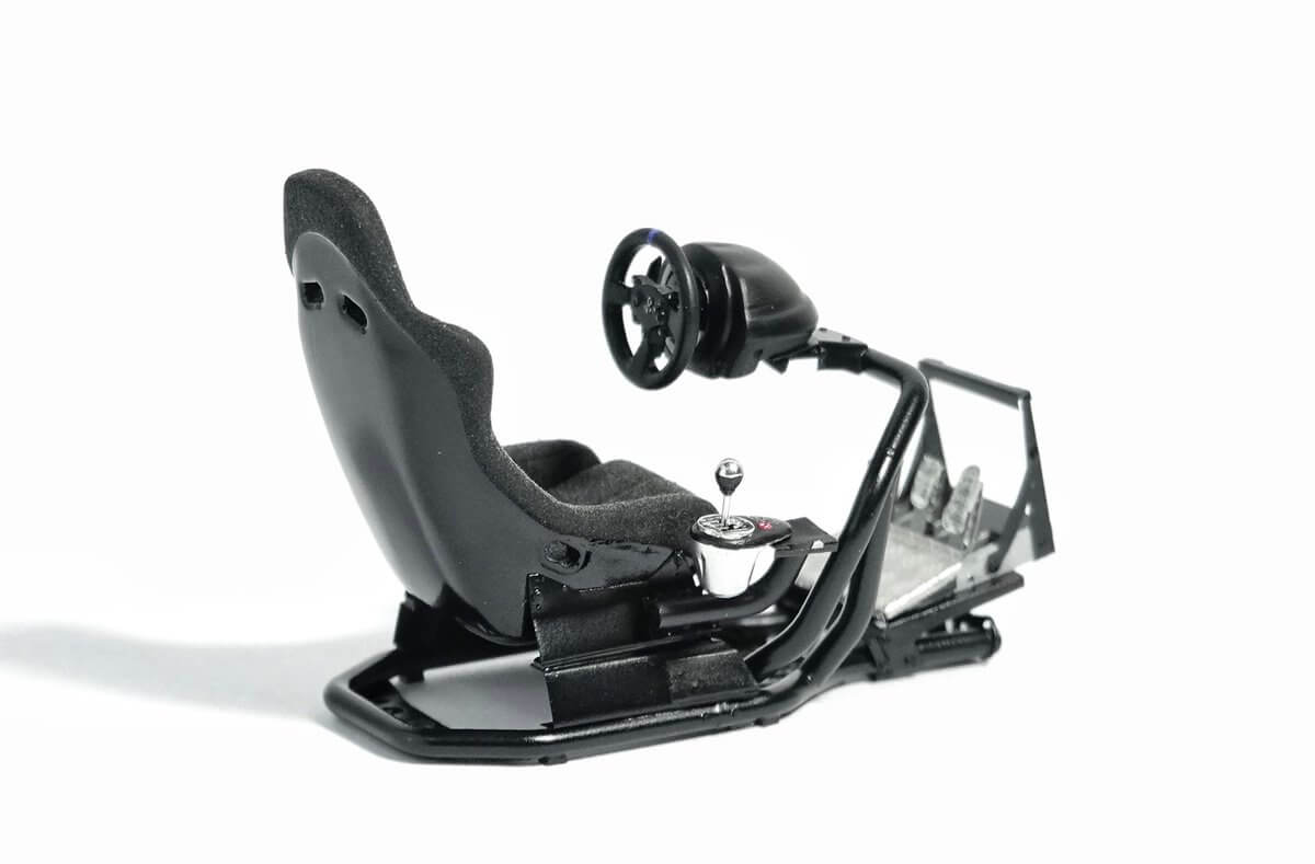 A close look at the gaming den diorama reveals some incredible details. The rig itself appears to be an RSeat RS1 model, based on a standard 1:24 model sports seat painted with a mixture of black paint and white powder to create a suede effect. Hooked up to the rig is a Thrustmaster T300 Racing Wheel, along with TH8A shifter and T3PA pedals.